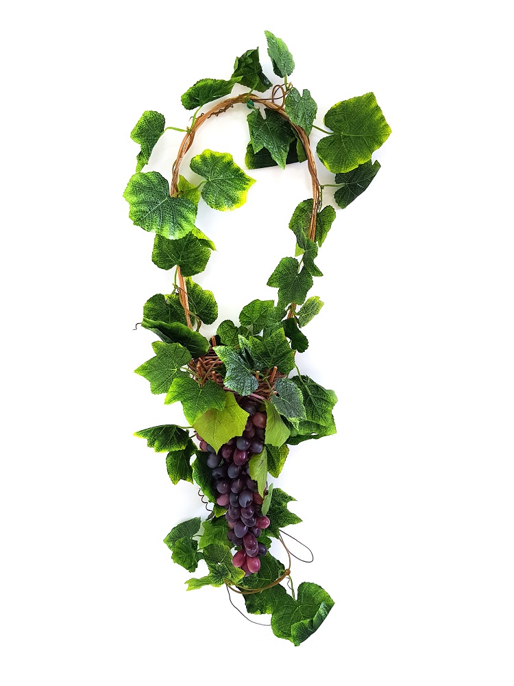 Длина - 60 см., ширина - 15 см., корзина сделана из лозы,  гроздь виногртада - полая резина, листья винограда - ткань с пропиткой.